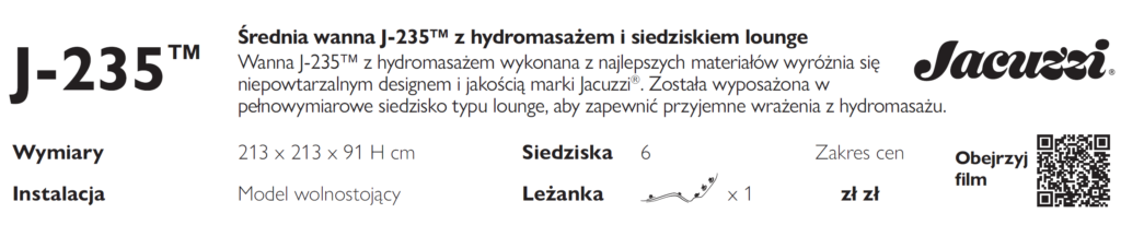 Średnia wanna J-235™ z hydromasażem z leżanką. Wanna J-235™ z hydromasażem wykonana z najlepszych materiałów wyróżnia się niepowtarzalnym designem i jakością marki Jacuzzi®. Została wyposażona w pełnowymiarowe siedzisko typu lounge, aby zapewnić przyjemne wrażenia z hydromasażu.