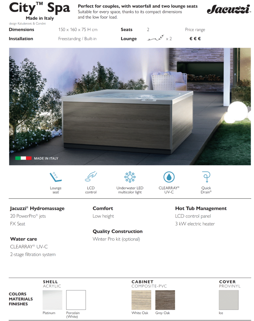 City™ Spa – innowacyjna wanna SPA, która łączy nowoczesny design z zaawansowaną technologią hydromasażu, idealną dla par. Dzięki zaledwie 2,4 m² powierzchni, zmieści się nawet w najmniejszych przestrzeniach, zarówno wewnątrz, jak i na zewnątrz. Unikalne dwa siedziska w formie leżanki oraz dysze do hydromasażu ustawione pod kątem 30° zapewniają profesjonalny relaks dla dwóch osób. Wanna jest dostępna zarówno w wersji wolnostojącej, jak i do wbudowania, co czyni ją doskonałym rozwiązaniem dla domowych łazienek, balkonów czy hotelowych stref wellness.