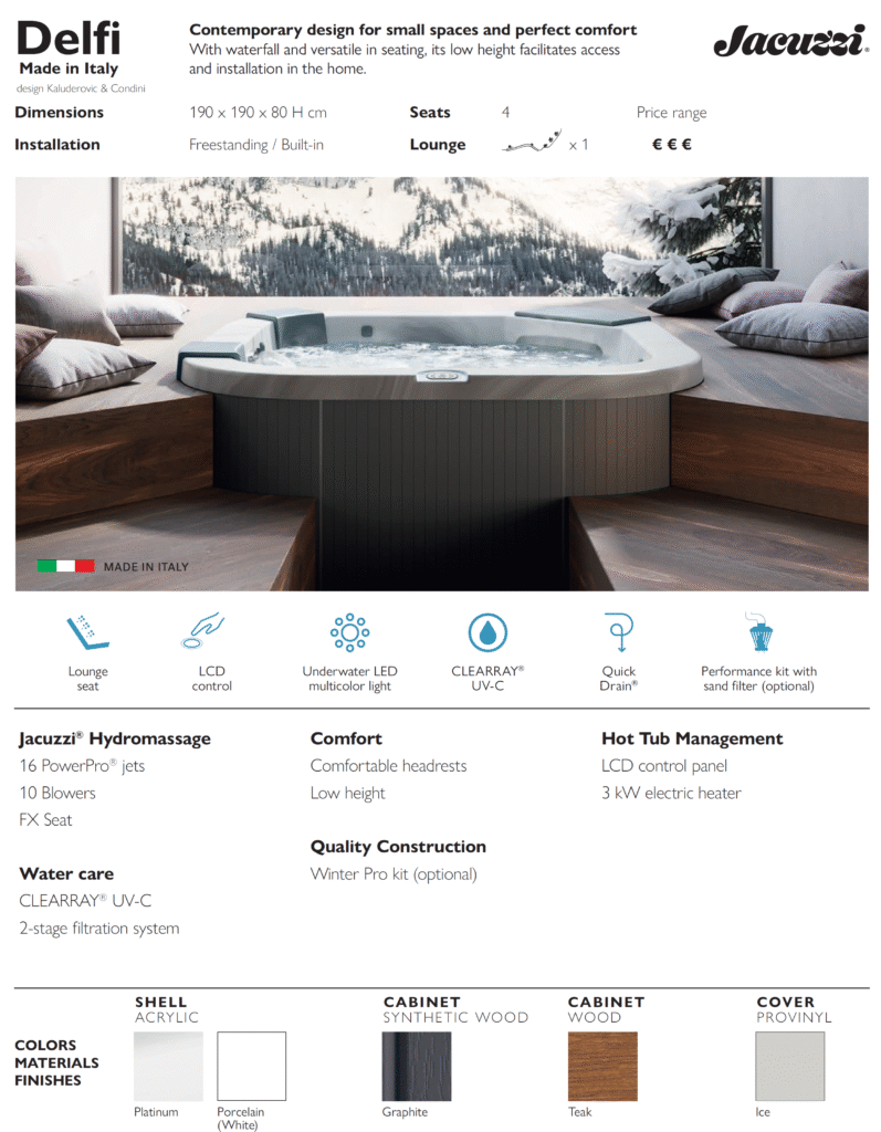 Delfi Pro Sound – elegancka wanna SPA, która łączy nowoczesny design z zaawansowaną technologią hydromasażu. Dzięki czterem wygodnym siedziskom, w tym jednemu w formie kanapy, idealnie sprawdzi się dla małych rodzin lub grup przyjaciół. Wanna wyposażona jest w regulowane dysze Power Pro®, które umożliwiają płynną regulację intensywności strumieni, zapewniając kompleksowy relaks i odprężenie.