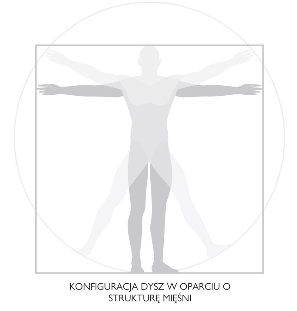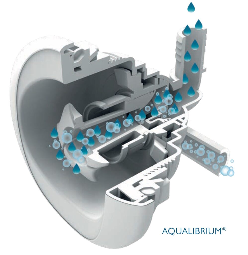 Dzięki formule Aqualibrium® każda dysza jest indywidualnie skalibrowana tak, aby zapewniać doskonałą równowagę wody i powietrza, która dodatkowo jest precyzyjnie dostosowana do ściśle określonego współczynnika „pompa – dysza”, aby na każdym siedzisku doświadczenia każdego użytkownika był optymalne.