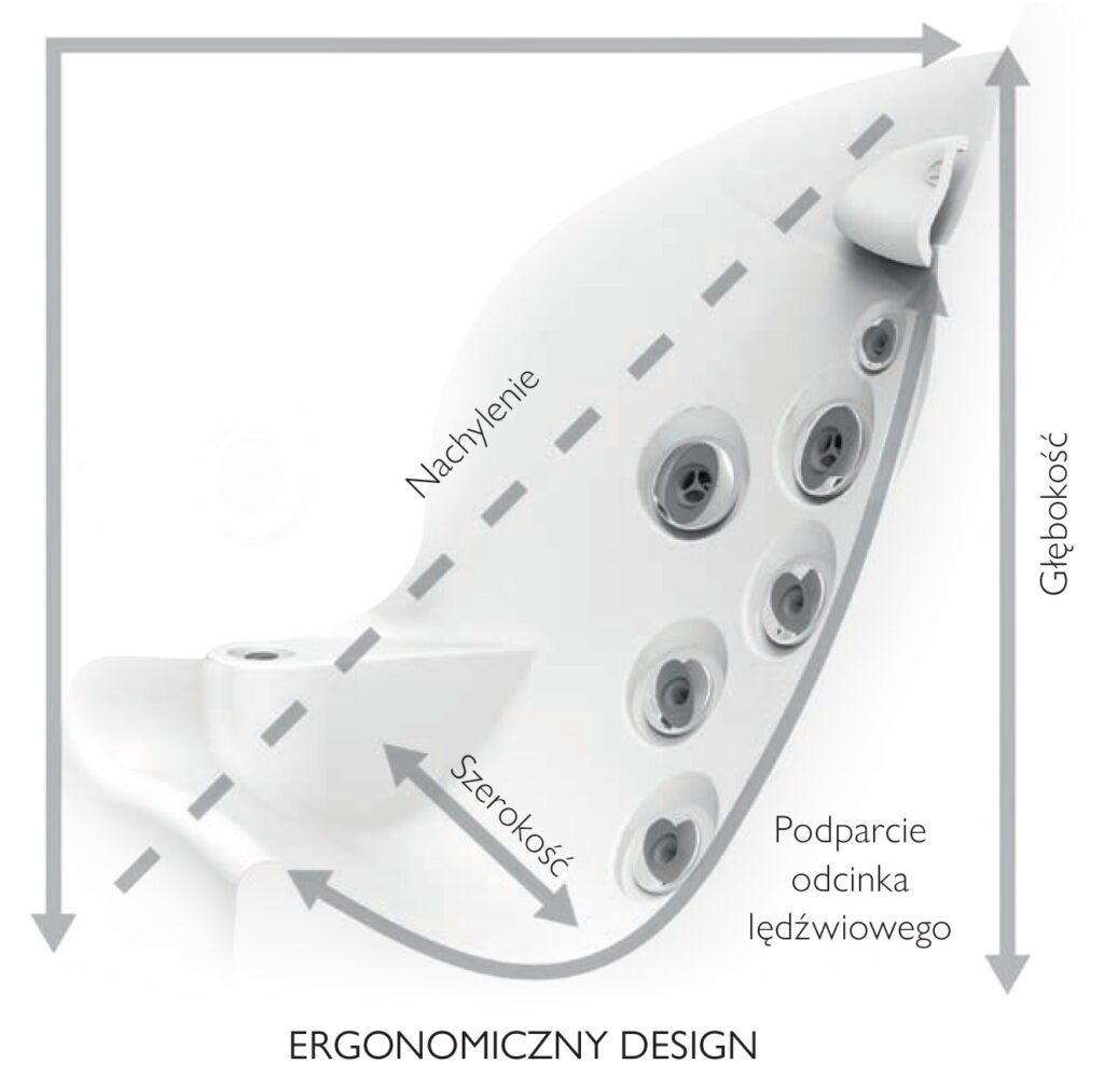Siedziska zaprojektowane zgodnie z sylwetką ciała i zagłębione dysze umiejscowione tak, aby idealnie pasować do struktury mięśni człowieka zapewniają każdemu, niezależnie od budowy ciała, komfortowy hydromasaż na najwyższym poziomie.